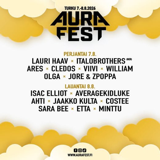 Kaupunkifestivaali Aura Fest juhlitaan Turun Kupittaanpuistossa perjantaista lauantaihin 7.-8.8.2026. Tapahtuman ensi kesän kaikki esiintyjät on julkaistu ja pääsylippujen myynti on aloitettu.