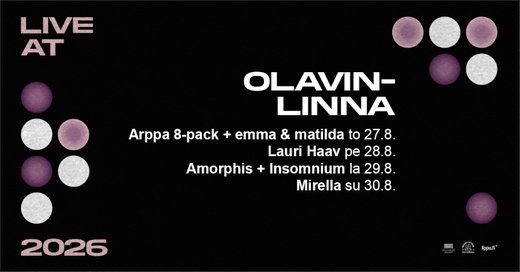 Savonlinnan Olavinlinnassa koetaan elokuussa uusi konserttisarja, joka tuo kuvankauniin linnan lavalle monipuolisen ja tarkoin valikoidun kattauksen kotimaisen musiikin rakastettuja taitureita. Live at Olavinlinna -keikoilla nähdään 27.–30. elokuuta Lauri Haavin ja Mirellan lisäksi Arppa 8-pack ja emma & matilda sekä Amorphis ja Insomnium yhteiskonserteissaan.