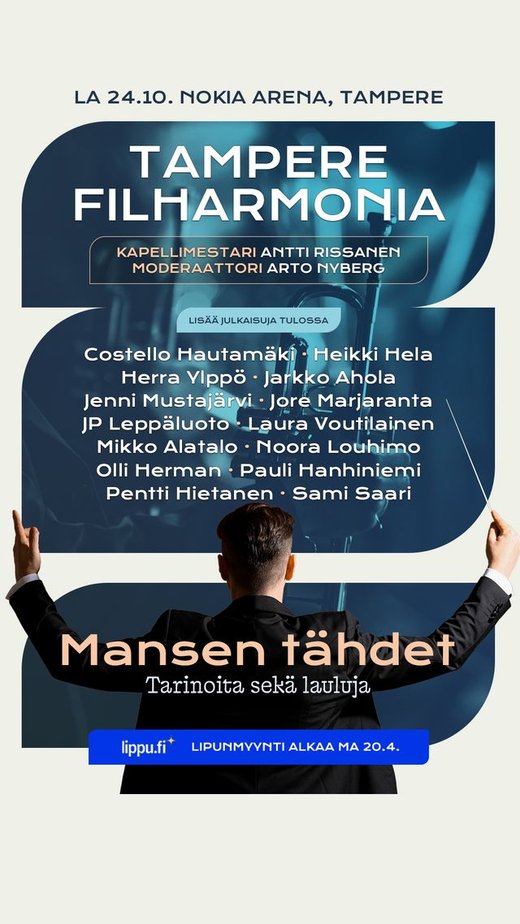 Tampereella nähdään lokakuussa todellinen konserttiharvinaisuus, kun Nokia Arenan lavalle nousee lähes kaksikymmentä Tampereelta kotoisin olevaa huippuartistia. Tämä Mansen tähdet – tarinoita ja lauluja -niminen konsertti nähdään 24. lokakuuta. Konsertin kruunaa Tampere Filharmonia johtajanaan Antti Rissanen.